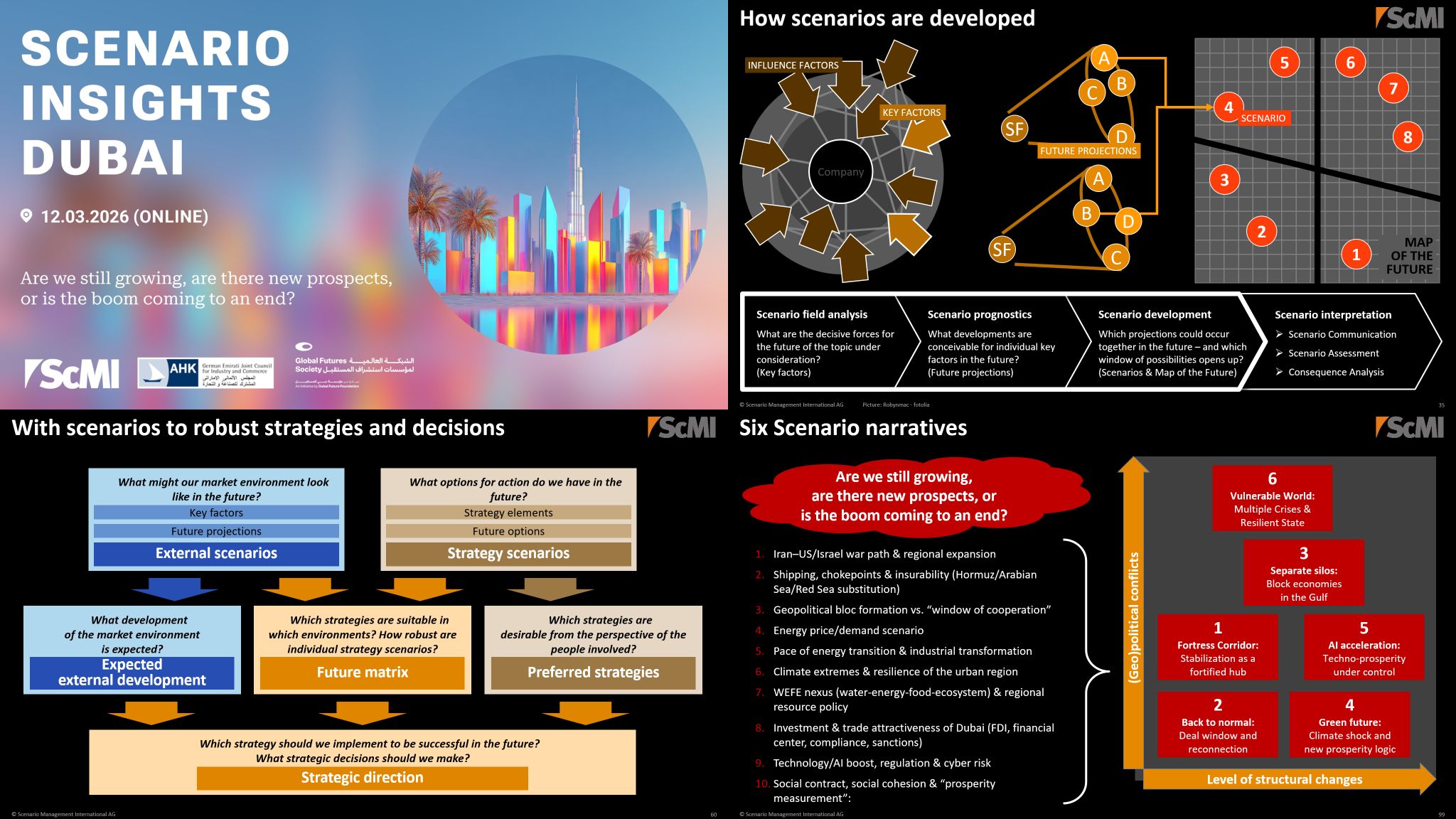 Hosted by ScMI and the German Emirati Joint Council for Industry and Commerce in partnership with the Global Futures Society, brought together foresight practitioners, industry experts, and partners to explore possible future scenarios for Dubai and the wider MENA region. The session introduced scenario management methodologies and explored alternative futures and strategic implications, highlighting how scenario thinking supports robust decision-making and strengthens collaboration and dialogue on future developments in the region.